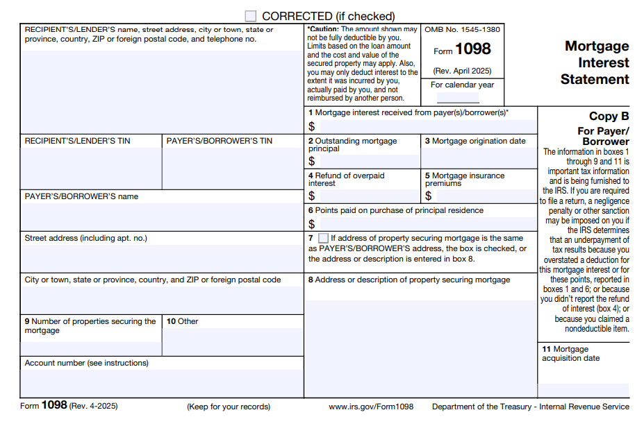 For full documentation on how Form 1098 fits into personal taxes, consult the IRS Mortgage Interest Deduction page.