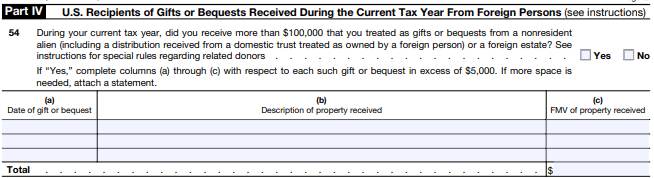 Line 54: If you received more than $100,000 from a foreign individual, you must list the date and description of each gift.