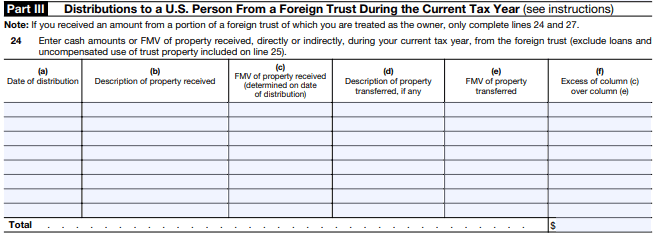 If you received a loan or a distribution (cash or property) from a foreign trust, you must report it here.
