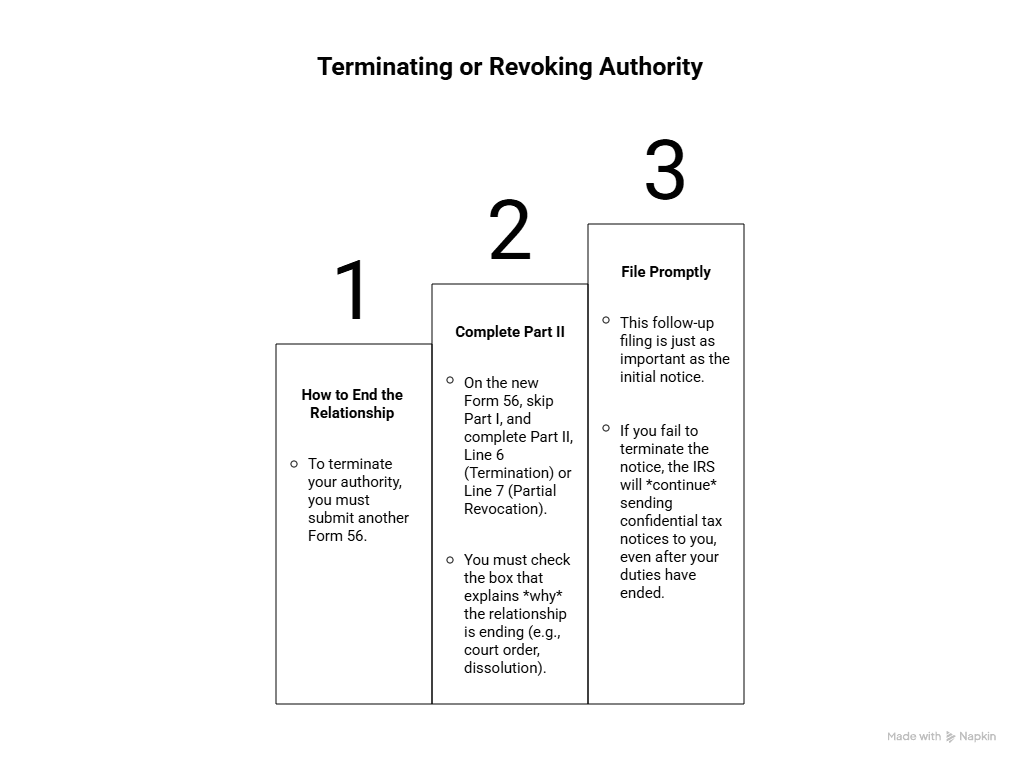 Mistake 4: Not Terminating the Notice: Forgetting to file a second Form 56 (completing Part II) when the fiduciary duties are over. This leaves the IRS sending confidential notices to an unauthorized or outdated representative.