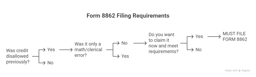 Ignoring Prior Disallowance | Not filing Form 8862 when required. If your credit was previously disallowed, you must file this form to reclaim it. | Review all prior IRS notices. If a notice mentioned disallowance (not just clerical error), plan to file Form 8862. |