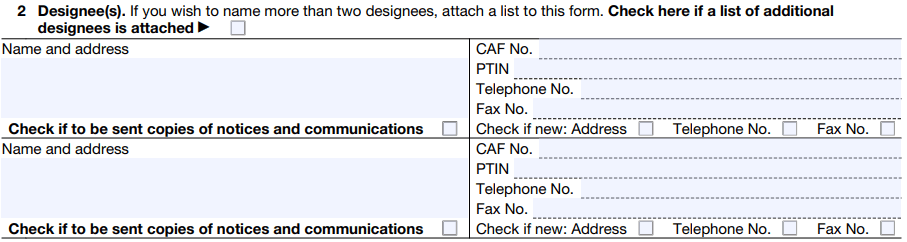 Missing CAF Number for Designee | Causes significant delays in processing since the IRS cannot easily link the designee to the Centralized Authorization File. | Request the designee's CAF number before filling out the form. |
