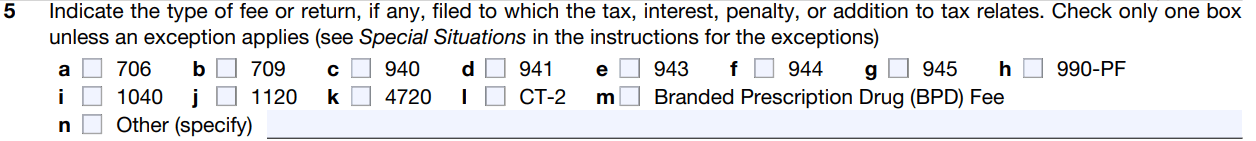 Guidance: If the penalty is for late payment of quarterly payroll taxes, you would likely check Box d (941). Check the instructions for the form that corresponds to the tax type you selected in Line 4.