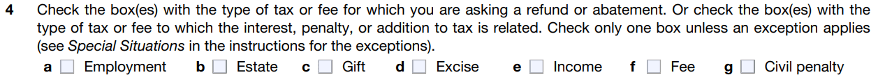 Check the box that indicates the type of tax or fee to which the penalty, interest, or refund is related.