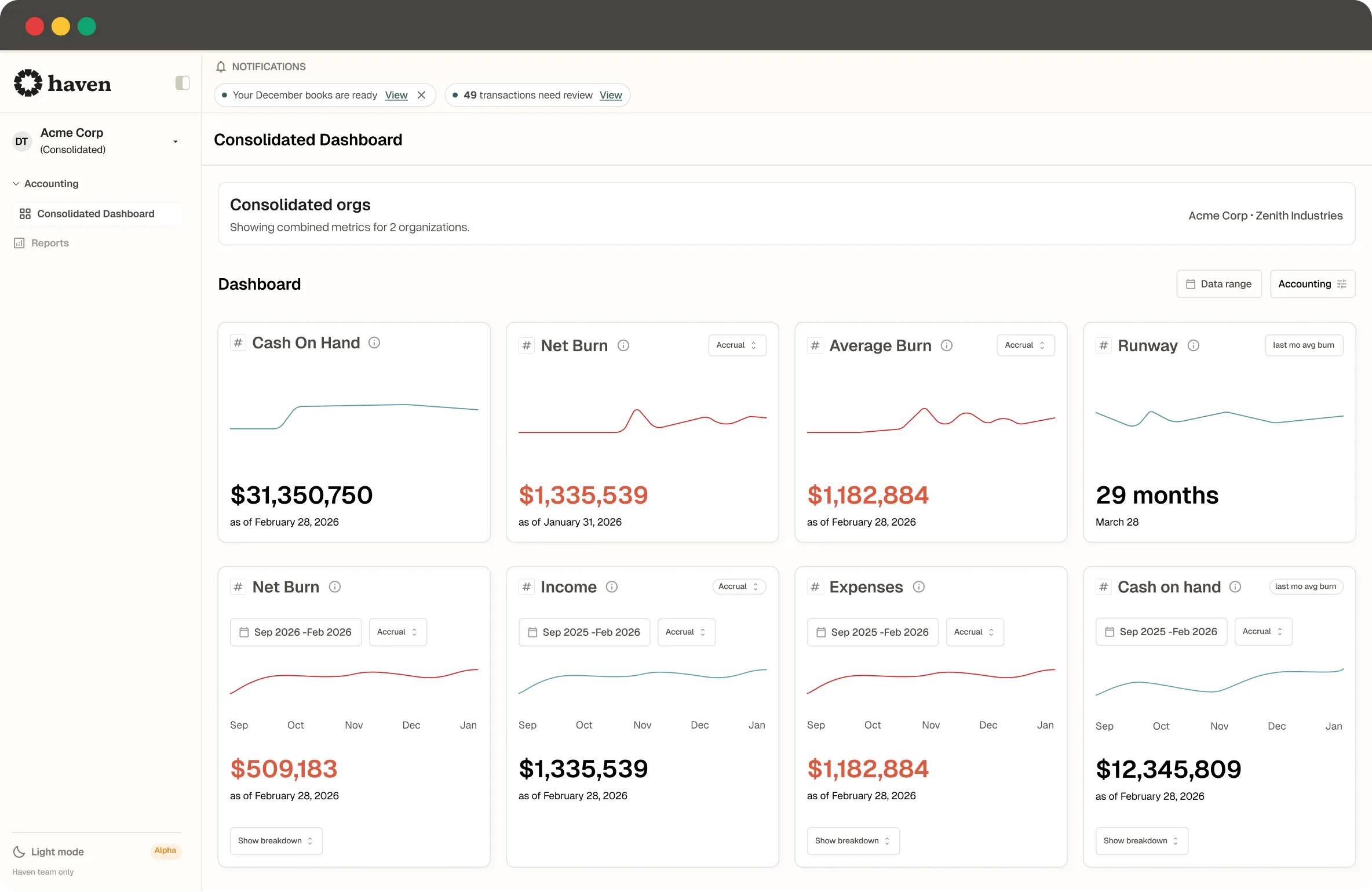 Haven manages bookkeeping across all your entities and automatically consolidates financials behind the scenes.