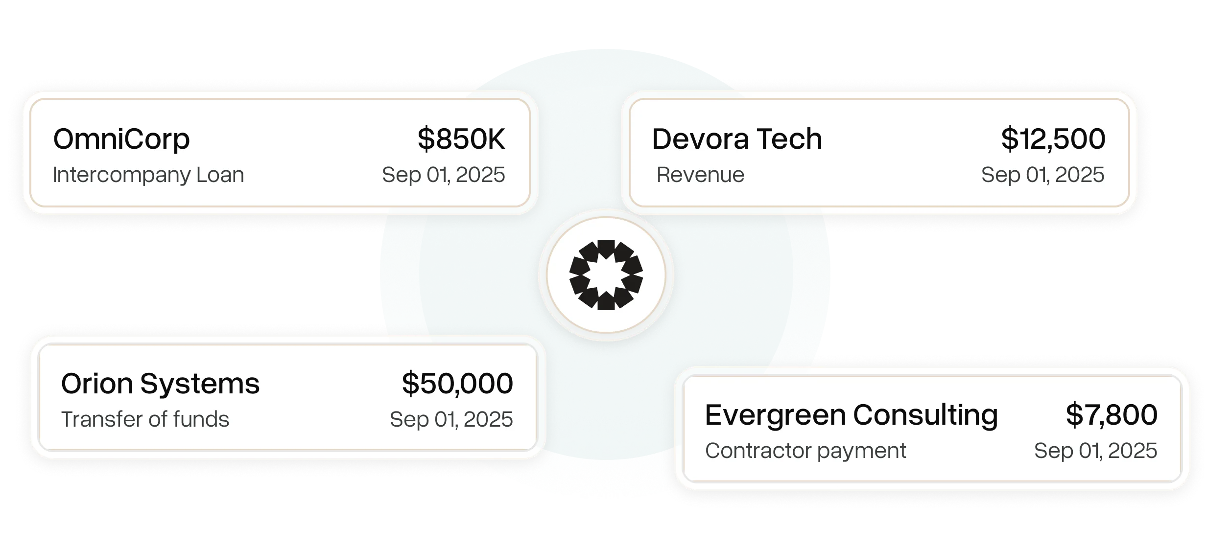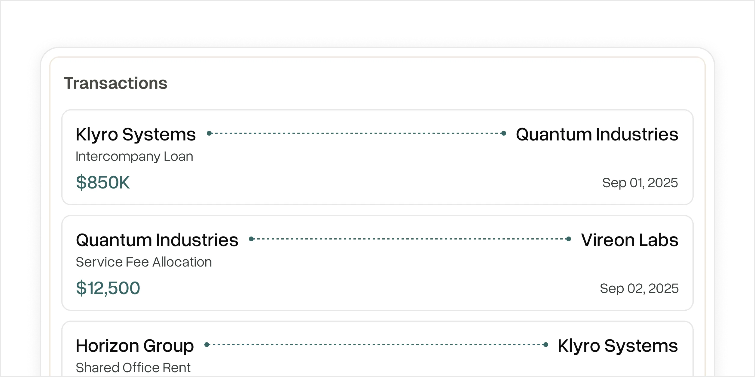 Transactions between entities are recorded and reconciled automatically.